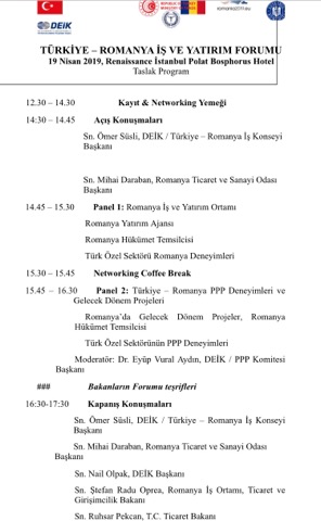 T.C. Ticaret Bakanımız Sayın Ruhsar Pekcan ve Romanya İş Ortamı, Ticaret ve Girişimcilik Bakanı Sayın Ştefan Radu Oprea’nın katılımlarıyla gerçekleşecek Türkiye – Romanya Ortak Ekonomik ve Ticaret Komitesi (JETCO) Birinci Dönem Toplantısı vesilesiyle 19 Nisan 2019 tarihinde Renaissance İstanbul Polat Bosphorus Hotel’de Türkiye – Romanya İş ve Yatırım Forumu düzenlenecektir.